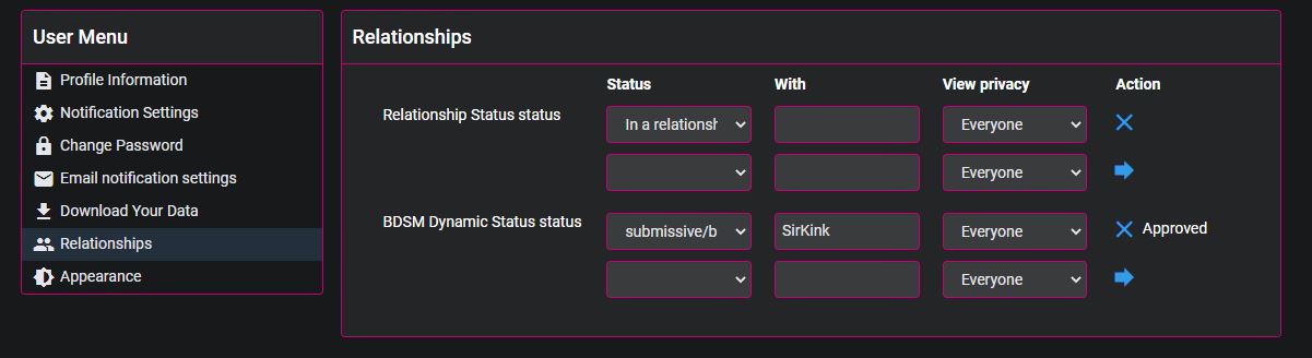 Our platform offers a unique and exciting feature where users can declare their relationship status with another user, including the type of relationship. This feature not only allows users to express their personal connections on their profile, but it also grants them autonomy over what information is displayed on their profile and on the profiles of other users. And for those who are in poly or ethically non-monogamous relationships, our platform even allows for multiple relationship statuses with other users.