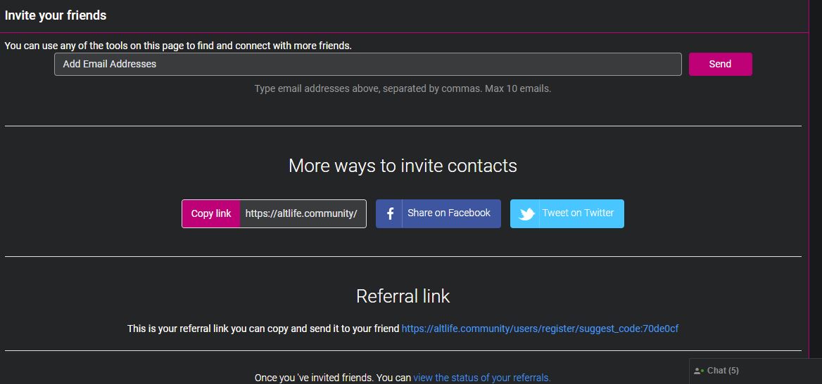 Want to help grow the Altlife community? Our friend inviter feature makes it easy! Just head to our Altlife.Connections tab to get a unique code that you can share with your friends. They can use the link or code to join the site and become your friend.